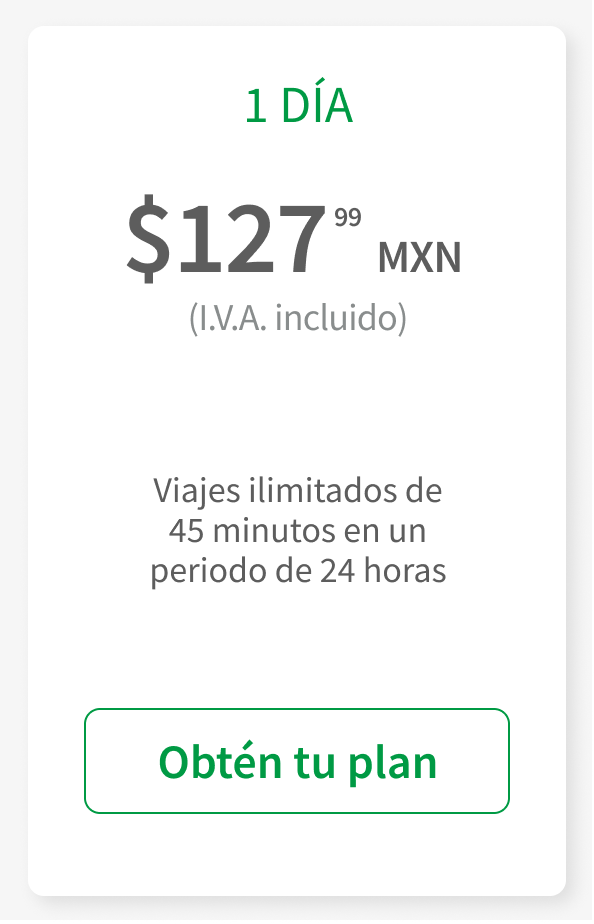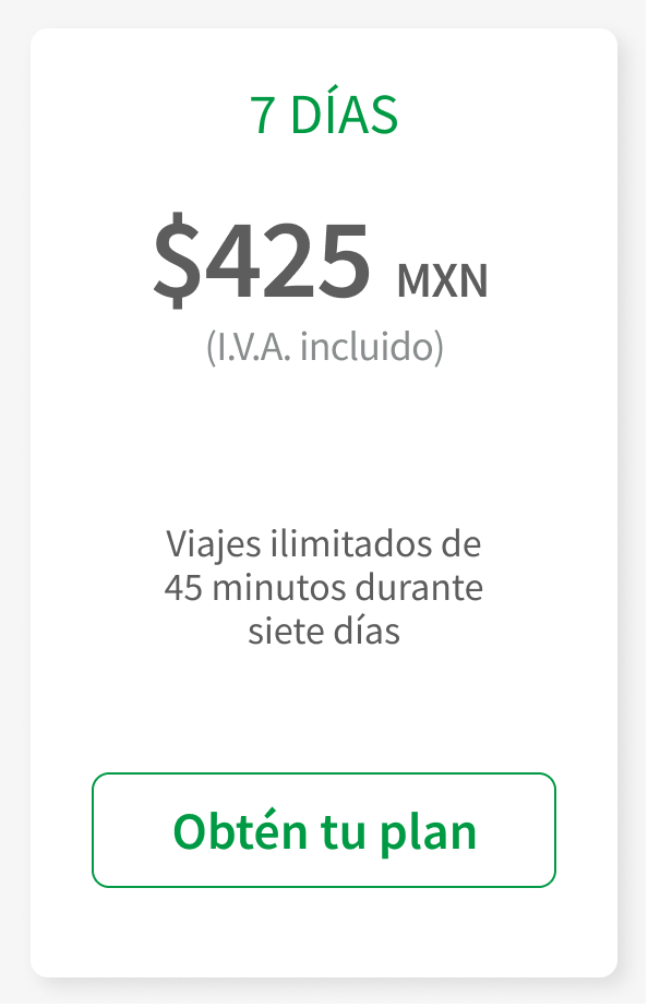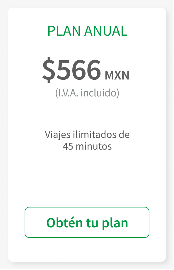 PLAN ANUALTodos los planes incluyen trayectos ilimitados de 45 minutos, en caso de viajes que excedan este tiempo aplican las siguientes tarifas (Todas las tarifas incluyen IVA):